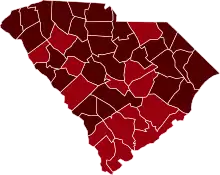 ![]() Map of the outbreak in South Carolina by confirmed total infections per 100,000 people (last updated March 2021)