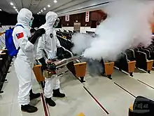 The Taiwan Tobacco and Liquor Corporation and the Taiwan Sugar Corporation increased production of 75 per cent alcohol for use in sanitation.[205] On 25 February 2020, the Heping Women and Children's Hospital, a branch of the Taipei City Hospital, was specially designated to care for patients with coronavirus.[206] From 4–31 March, the export of digital thermometers was banned.[207][208] On 16 March, the Tsai Ing-wen presidential administration announced that Makalot Industrial and other Taiwanese companies would begin domestic mass production of protective gowns, ending a reliance on American imports from DuPont during the pandemic.[209] A ban on the export of hand sanitizers and other disinfectants was announced on 1 May 2020.[210]