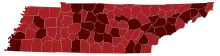 ![]() Map of the outbreak in Tennessee by confirmed total infections per 100,000 people (last updated March 2021)