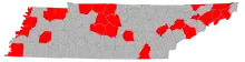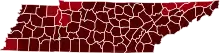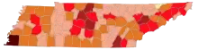 ![]() Map of the outbreak in Tennessee by confirmed new infections per 100,000 people over 14 days (last updated March 2021)