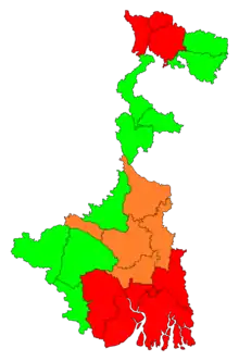 The West Bengal government on Monday released a list, saying four districts, including Kolkata, have been declared as red zones in the wake of the COVID-19 outbreak, and 348 areas as containment zones,[51] out of which Kolkata has 227. There are some districts in Orange & Green zones. The lockdown process will be strict in those Red Zone Containment areas. Some relaxation will be given to Orange zones and Most relaxation will be given to Green Zones.
