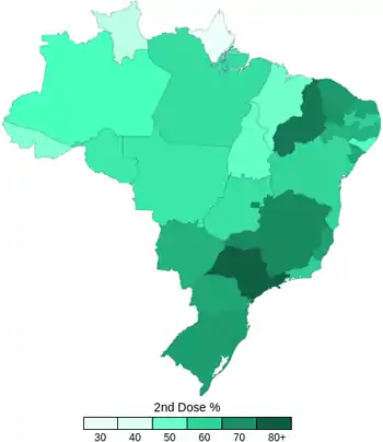 On August 25, 2021, the Ministry of Health announced that booster vaccination would begin on September 15 for people over 70 years who have been fully vaccinated for at least six months and for individuals with immunodeficiency fully vaccinated for at least 28 days.[87] On August 31, the cities of Salvador and Curitiba began administering booster doses to the elderly ahead of schedule,[88] soon followed by most other state capitals.[89]