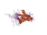 The Kinase-Inducible Domain (KID) Interacting Domain (KIX), also is the protein domain on CBP and p300 where heterodimers form from the interaction of CBP (or p300) with other transcription factors and coactivataors. It consists of three alpha and two 310 helices that have high affinity for amphipathic protein sequences.[19] Interestingly, these helices can fold into a number of different conformers which enables the domain to maintain both a level of promiscuity while also exerting regulatory control.[19] The KIX domain controls the rate of transcription and has been shown to be critical for hematopoietic differentiation.[8][19][20] Some of the proteins that bind to this domain have been shown to bind competitively—such as CREB and Myb—whereas others bind via allosteric cooperation as in the case of MLL and Myb.[19]