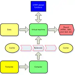 As represented in the diagram below the architecture of the template engine consists of 4 subsystems: a template compiler which converts the text of the page template into bytecode, a virtual machine which executes the bytecode, a caching system for templates, and a library of data processor functions.