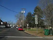 Route 77 begins at an intersection with Route 146 at the Guilford town green as Whitfield Street. It runs around the west side of the green, then shifts to Church Street as it leaves the green. Route 77 crosses US 1 and I-95 (at exit 58), becoming the main road through the northern part of Guilford, past Lake Quonnipaug. Between I-95 and the Durham town line, Route 77 is known as Durham Road. It has a junction with Route 80 (leading to Killingworth and North Branford) about 5.4 miles (8.7 km) north of I-95, then crosses into the town of Durham, where the road changes name to Guilford Road. Route 77 runs for another 2.3 miles (3.7 km) in Durham and ends at an intersection with Route 17 just south of the town center, near the northern end of Route 79. The entire route is classified as a collector road and carries average daily traffic volumes of about 5,900 vehicles.[1]