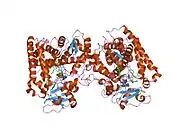 CYP2C9 is a crucial cytochrome P450 enzyme, which plays a significant role in the metabolism, by oxidation, of both xenobiotic and endogenous compounds.[7] CYP2C9 makes up about 18% of the cytochrome P450 protein in liver microsomes. The protein is mainly expressed in liver, duodenum and small intestine.[7] About 100 therapeutic drugs are metabolized by CYP2C9, including drugs with a narrow therapeutic index such as warfarin and phenytoin, and other routinely prescribed drugs such as acenocoumarol, tolbutamide, losartan, glipizide, and some nonsteroidal anti-inflammatory drugs. By contrast, the known extrahepatic CYP2C9 often metabolizes important endogenous compounds such as serotonin and, owing to its epoxygenase activity, various polyunsaturated fatty acids, converting these fatty acids to a wide range of biological active products.[8][9]
