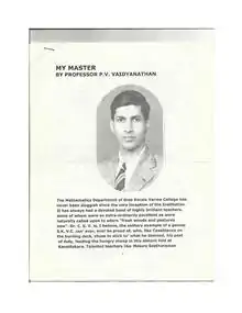 In view of his contributions to the theory of numbers, CSV was nominated for a visiting professorship at the University of North Carolina, Durham, NC, US. This was for possible collaboration with Leonard Carlitz, who came to know about CSV's research interest. Though CSV wanted to continue with full-time research, some sudden turn of events in his family circumstances forced him to be near his home town and hence he accepted an offer of a lectureship at Union Christian College, Aluva. After spending a brief time there, he joined the Sree Kerala Varma College, Thrissur, in 1947, where he remained as a professor till retirement. The college he chose to serve had no pretensions of being in the elite league of colleges in Kerala, and it was usually dubbed as a common man's college.[1] Because of his passion for research and teaching, CSV also did not accept the post of the principal of the college, a position which was offered to him at a very young age. Due to CSV's active interest in research, the Department of Mathematics of Sree Kerala Varma College was recognized as a research centre for mathematics by the University of Kerala in 1961. A.C. Vasu and R. Sivaramakrishnan were his doctoral students.