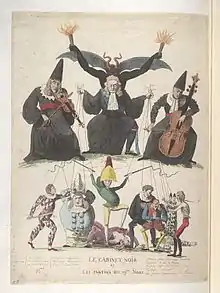 In France, the cabinet noir (French for "black room", also known as the "dark chamber" or "black chamber") was a government intelligence gathering office, usually within a postal service, where correspondence between persons or entities were opened and read by government officials before being forwarded to their destination.[1] However, this had to be done with some sophistication, as it was considered undesirable if the subjects of the practice knew about it, and "that the black chamber not interrupt the smooth running of the postal service."[2] This practice had been in vogue since the establishment of postal and telegraphy services, and was frequently used by the ministers of Louis XIII and Louis XIV; but it was not until the reign of Louis XV that a separate office for this purpose was created. This was called the cabinet du secret des postes, or more popularly the cabinet noir. Although declaimed against at the time of the French Revolution, it was used both by the revolutionary leaders and by Napoleon.[3][4]