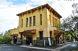The station consists of a single bay platform, and when it is crowded, the doors on both sides of the train may be opened to drop passengers. The station building was built in 1925 and is a two-story Western-style structure with a ticket office, a waiting room, operator room, and a crew waiting room on the first floor. There used to be a guest room on the second floor, but now it is open to the public as a gallery, and observation terrace. The station building received protection by the national government as a Registered Tangible Cultural Property in 2017.[1]