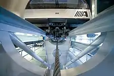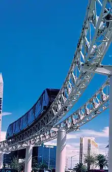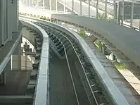 The automated people mover uses a self-supporting steel guideway. It is a light steel guideway, which is possible because of the use of lighter trains. The track consists of an I-beam which forms the running and guiding surface.[5] The guideway superstructure is a steel framework construction. The guideway does not require heating in harsh winter conditions.[5] Steel adapters between the steel truss guideway and the concrete columns allow height adjustments to compensate for ground settlements.[6] The track can span more than 67 m (220 ft).
