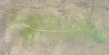 Fanwort is a submerged, sometimes floating, but often rooted, freshwater perennial plant with short, fragile rhizomes. The erect shoots are upturned extensions of the horizontal rhizomes. The shoots are grass-green to olive-green or sometimes reddish-brown. The leaves are of two types: submerged and floating. The submerged leaves are finely divided and arranged in pairs on the stem. The floating leaves, when present, are linear and inconspicuous, with an alternate arrangement. They are less than 1⁄2 in (13 mm) long and narrow (less than 1⁄4 in or 6.4 mm). The leaf blade attaches to the centre, where a slight constriction is seen. The flowers are white and small (less than 1⁄2 in (13 mm) in diameter) and are on stalks that arise from the tips of the stems.