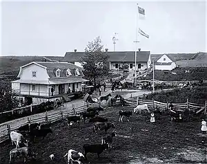 Cabriolet with retracted hood in a mise en scène at Wilfred Rotte's farm in Saint-Jérôme, Quebec, c. 1906.