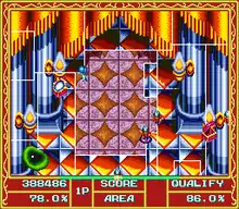 Enemies can impede progress of the player and come in various shapes, sizes and speeds. Some enemies can only move along the borders of the screen and the chalk lines that the player creates, others have free rein of the screen within given borders. Enemies can be destroyed by trapping them within an area of chalk, however, they will repopulate quickly thereafter. The player must avoid getting hit by enemies. If the player allows the character to get hit by the enemies too many times (based on the difficulty), they will be brought to a continue screen. Continuing costs one Credit, of which the player has a predetermined amount based on the difficulty that they are playing on. If the player runs out of the Credits, the game ends.