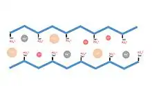 The heavily phosphorylated β-sheet of caddisfly larvae contains strong negative charges which have been found to interact with di- and trivalent cations found naturally within the larvae’s aquatic environment. These cations, including calcium, magnesium, and iron, are vital to maintaining the rigid structure of the silk’s β-sheet.[8] The ionic interactions between negatively charged serines and these cations produce a crystal with a unit cell of 5.9 Angstroms x 23.3 Angstroms x 17.3 Angstroms, as determined by X-Ray Diffraction.[9] The necessity of these cations was shown using EDTA to chelate and remove them from the protein structure, producing a mobile, noncrystalline protein.[10] Reintroduction of monovalent ions failed to restore the crystalline structure, however reintroduction of calcium or other multivalent ions successfully restored the rigidity to the H-fibroin protein[11]