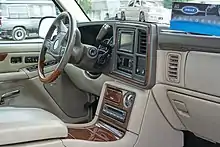 The "StabiliTrak" electronic stability control system was upgraded to a four-wheel version, High Intensity Discharge (HID) low beam headlights, power-adjustable pedals and signal outside mirrors were added as a standard feature in 2003, along with a Bulgari-branded clock.[7] For 2004, XM Satellite Radio, second-row bucket seats, and a tire pressure monitoring system were made standard on all Escalades except the EXT. Also in 2004, the Platinum edition Escalade ESV was introduced at a base price of $71,025; it featured the luxury utility segment's first factory-installed 20-inch chrome wheels, a slightly lowered suspension, heated and cooled seats (front and back), heated and cooled cup holders, moon roof, second and third row monitors, an interior that included an ebony and shale dashboard, shale leather upholstery and pleated door panel bolsters, a chrome grille, and a standard 6.0 liter V8 producing 345 hp (257 kW). The OnStar system was upgraded for the 2005 model year and had become a digital system instead of the analog system that had been in use.