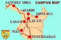 The university is composed of eight campuses in the growth areas in the three congressional districts of Cagayan; the Aparri, Lal-Lo and Gonzaga campuses in the 1st District; the Piat, Lasam and Sanchez-Mira campuses in the 2nd District; and in the 3rd District, the Andrews and Carig campuses in Tuguegarao City. Each campus is headed by an Executive Officer (CEO) except in Andrews Campus where the University President concurrently acts as the CEO. The seat of governance of the university is at the Andrews Campus, where the central administration holds office.