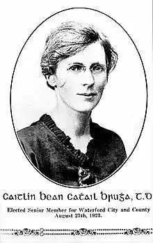 Cathal Brugha died in battle on 7 July 1922 in the first days of the Irish Civil War, having taken the Republican side opposing the Anglo-Irish Treaty. His death left her widowed with six children under the age of 10. She ran in the same constituency that her husband represented and was elected to Dáil Éireann as a Sinn Féin TD at the 1923 general election for the Waterford constituency.[2] In accordance with Sinn Féin policy of the time she did not take her seat in Dáil Éireann. She stayed with the abstentionists of Sinn Féin when Éamon de Valera left to found Fianna Fáil in 1926.