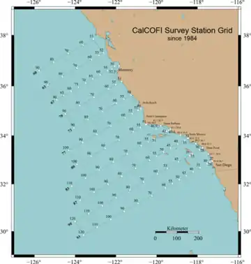 CalCOFI sampling lines were designed to be normal to the central California coast centered at Point Conception, designated as CalCOFI Line 80. The original sampling pattern extended from Line 10 at the US-Canada border to Line 120 off Point Eugenia, Baja California Mexico with a spacing of 120 miles between lines (i.e. distance between line 80 and 90 is 120 miles). Since its conception, additional lines were added within the domain creating a 40-mile spacing between lines which are now numbered in fractions of 3's and 7's (80, 83, 87, 90, etc.).[8]
