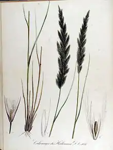 Calamagrostis pseudophragmites is a species of grass in the genus Calamagrostis and the family Poaceae. It occurs along water, canals and rivers in Europe. It is a perennial species, blooming in June and July. The stem is smooth less hairy than the other species in the genus. This grass species grows up to 1.2 meters high, the leaves are approximately 6 mm wide/broad,and roll in their edges/margin. The spikelets in the over-hanging panicle are coloured violet, and the lower bract has a needle on it. The sepals/bracts are longer than those of the spikelets.