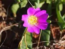 There are three to four flowers at the top of each stem or on short leafy branches.[1] Flowers are vivid dark pink or purple with five petals 11 to 15 mm long and bright yellow stamens in the center.[2] The flowers open during the day and close just before sunset. The fruit is a small capsule that contains numerous dark-red seeds. The capsule is 5 to 9 mm long and 4 to 7 mm wide, and the seeds are at least 1 mm in diameter.[1]
