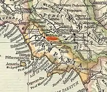 Cālātia was an ancient town of Campania, southern Italy, c. 10 km southeast of Capua, on the Via Appia, near the point where the Via Popillia branches off from it. It is represented by a locality known as Villa Galazia and by the church of San Giacomo alle Galazze (or San Giacomo delle Galazze or San Giacomo Le Galazze), within the modern town of Maddaloni, very near the boundary with the neighboring town of San Nicola la Strada, and right on the Via Appia. The Via Appia here, as at Capua, abandons its former SE direction for a length of 2,000 Oscan feet (500 m), for which it runs due east and then resumes its course SE.[1] Ruins include remains of the walls (with sector from the Samnite age, in tuff, and others from the Sulla period) and the pre-Roman necropolis was partially excavated in 1882. The ten shafts lined with slabs of tuff which may have been the approaches to tombs or may have served as wells.[1]