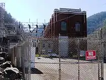 Calderwood's powerhouse is located 1.2 miles (1.9 km) downstream from the dam, on the opposite side of the horseshoe bend in the river. A submerged intake just upstream from the dam diverts water into a 2,150-foot (660 m) concrete tunnel, which carries the water to the other side of the peninsula, where it spills down three penstocks to a valvehouse. The penstocks measure approximately 18 feet (5.5 m) in diameter, and range in length from 330 feet (100 m) to 388 feet (118 m). The valve house is built of steel-reinforced concrete, and is equipped with three Francis turbines.[5] The powerhouse, a larger brick structure adjacent to the valvehouse, is equipped with three Westinghouse generators with a combined capacity of 140.4 megawatts.[1] The powerhouse complex, located adjacent to a rockslide-prone cliffslope, is protected by a V-shaped reinforced concrete wall.[5]