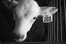 Calf 269 is a bull who was rescued as a calf by anonymous activists, days before his planned slaughter. He was born at an Israeli facility in the vicinity of Azor, a town on the outskirts of Tel Aviv. The slaughter was scheduled for June 2013.[1] He is described as sweet-tempered and white-headed, and his ear carried a tag numbered 269, indicating he was destined for slaughter.[2] The Israeli protests regarding the calf were followed by protests in the U.K. and other places across the world. The protests aimed at conveying that animal parts eaten as food by humans once belonged to a living individual, who lived a tortured life and faced a brutal death, after which his or her carcass was processed into human food.[3] The significance of the event led to the creation of "269 life"(fr:269 Life France), an animal liberation movement founded in October 2012.[4]