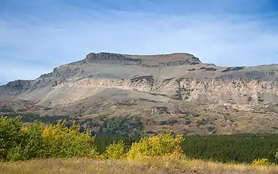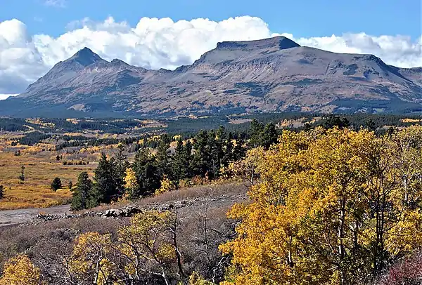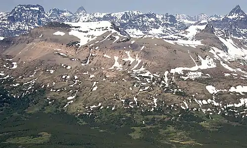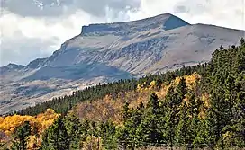 Calf Robe Mountain is a 7,948-foot-elevation (2,423 meter) mountain summit located in Glacier National Park in the U.S. state of Montana.[3] It is situated on the Continental Divide in the Lewis Range, and can be seen from Highway 2 midway between Marias Pass and East Glacier Park. The summit is set on the border shared by Flathead County and Glacier County. Topographic relief is significant as the east aspect rises 2,500 feet (760 meters) in one mile. The immediate area between the mountain and highway is known for its aspen and beaver dams.[4]
