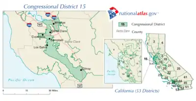California's 15th congressional district is a congressional district in the U.S. state of California. The district is currently represented by Democrat Eric Swalwell. The district currently covers most of eastern and southwestern Alameda County as well as part of Contra Costa County. Cities and CDPs in the district include Castro Valley, Dublin, Hayward, Livermore, Pleasanton, Sunol, and Union City; most of San Ramon; and parts of Danville and Fremont.