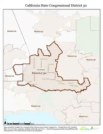 California's 30th congressional district is a congressional district in the U.S. state of California, in the western San Fernando Valley of Los Angeles County and the eastern Simi Hills of Ventura County. The district is currently represented by Democrat Brad Sherman, who won the November 2012 Election for the seat.[3]