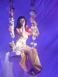 In the next section, a video interlude reveals that the mimes' brownie has transformed Perry into a catwoman, a plan executed by the evil butcher all along. "Circle the Drain" gets performed while Perry battles her dancers who are dressed as butchers before going into "E.T." where laser beams run across the stage while a futuristic lyrics video is projected on the screens.[23] The show continues with "Who Am I Living For?" in which she was captivated by her dancers and strapped with elastic strings while being thrown back and forth and at the end of the performance is left on the ground defeated. She is then saved by her two backup singers who dress her in a sparkling dress and moves into "Pearl", at one moment she is lifted in the air sitting in the backs of two aerialists, while near the end Perry moves into the end of the catwalk on the stage where an area of the stage goes up in the air lifting her up. After a brief video interlude, Perry reappears on stage sitting on a swing to perform "Not Like the Movies".[24] During the performance, Katy is lifted high above the stage as images of cartoons kissing are projected behind her.[24] At the end of the number, Perry and her band move to the catwalk. Perry interacts with the audience, and introduces her band members, and picks her guitar to perform an acoustic version of "The One That Got Away", while in selected UK dates, Perry mashed the song with Adele's "Someone Like You". Then, she goes on to perform an acoustic medley of songs such as Rihanna's "Only Girl (In the World)", Jay Z's "Big Pimpin'", Willow Smith's "Whip My Hair", and Rebecca Black's "Friday" while interacting with the public.[25] A giant pink colored cloud descends to the stage and Perry gets on top of it, she is then elevated above the crowd and performs "Thinking of You".[26] When Perry exits the stage, the band and the dancers perform a medley of songs such as "I Want Candy", "Milkshake", "How Many Licks?", and "Tootsee Roll.