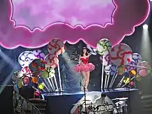 The show begins with a video screen introduction directed by Cole Walliser which tells the story of a girl named Katy who lives in a colorless world wasting her life cutting meat for a mean old butcher. One night, Perry escapes her dreadful reality by falling asleep and visits a vibrant candy land in search of her pet cat, Kitty Purry, and also for her love interest, the Baker's Boy, played by Nick Zano.[20] Katy appears on stage and starts performing "Teenage Dream" with her dancers, while wearing a white dress with spinning peppermints.[21] "Hummingbird Heartbeat" and "Waking Up in Vegas" are performed next, the latter accompanied by a human slot machine, showgirls and an Elvis Presley impersonator.[22] She leaves the stage briefly for a costume change while a video interlude shows Perry taking a shortcut that leads her into a candy forest where she meets two naughty mimes who join her on stage to perform "Ur So Gay". At the end of the performance, Perry takes a bite of their magical brownie.[20] Perry then makes a wardrobe change on stage, trading her skirt for a feathered tail while she begins to perform "Peacock", an elaborated feathered fan dance number.[20] After that, she is covered by peacock tails held by her dancers, and makes a costume change on stage by removing her peacock tail and wears a colorful vampy torch-singer garb over her blue suit. Perry interacts with the audience and invites a male fan on stage to flirt and kiss,[23] and then goes on to perform a slow version of "I Kissed a Girl" which shorty transforms into a rock version. Perry then exits the stage for a costume change while two female dancers keep dancing on stage until the song ends.