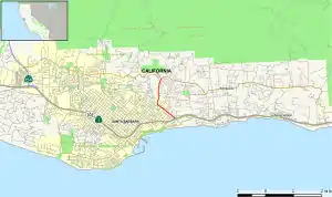 Except where prefixed with a letter, postmiles were measured on the road as it was in 1964, based on the alignment that existed at the time, and do not necessarily reflect current mileage. R reflects a realignment in the route since then, M indicates a second realignment, L refers to an overlap due to a correction or change, and T indicates postmiles classified as temporary ().[1] Segments that remain unconstructed or have been relinquished to local control may be omitted. The entire route is in Santa Barbara, Santa Barbara County.