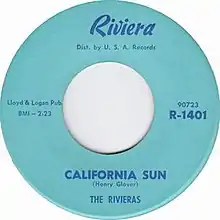 The most successful version of the song was released by the Rivieras in 1964 and became the group's biggest hit in their short career. This song was the result of their first recording session at Chicago's Columbia Recording Studios in 1963 (purchased by manager Bill Dobslaw). The lineup for this session included Marty Fortson on vocals and rhythm guitar, Joe Pennell on lead guitar, Doug Gean on bass guitar, Otto Nuss on Vox Continental organ, and Paul Dennert on drums. The original single cut from this session included the song "Played On" as the A-side, with "California Sun" as the B-side and was released on Dobslaw's Riviera label in 1963. DJ Art Roberts ensured that the "California Sun" side saw significant airplay on WLS. In response to the growing success, Dobslaw got the band a national distribution deal with USA Records, and the song was adequately distributed with "H.B. Goose Step" as the B-side.