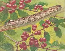 Drawing of the caterpillar (fourfold enlarged) on Lonicera xylosteum