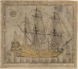 The Met's galleon is done in ink-and-gold on paper. The prominently displayed ship depicted by the calligram is a galleon, a large warship famously used by the Spanish and Portuguese empires during the Age of sail.[4] Due to the Ottoman navy frequently encountering the large Spanish ships in the Mediterranean, the empire's navy built a number of their own galleons to counter the Spanish threat. Thus, the Met's calligram was likely created in honor of the commissioning of new galleons into the Ottoman navy. An example of a similar calligram, depicting a 17th-century oared ship, is in the collection of the Topkapı Palace Museum in Istanbul, Turkey.[1][5]
