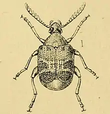 Callosobruchus chinensis is a common species of beetle found in the bean weevil subfamily, and is known to be a pest to many stored legumes.[1] Although it is commonly known as the adzuki bean weevil it is in fact not a true weevil, belonging instead to the leaf beetle family, Chrysomelidae. Other common names include the pulse beetle, Chinese bruchid and cowpea bruchid.[2] This species has a very similar lifestyle and habitat to Callosobruchus maculatus and their identities are often mistaken for each other.[3] This beetle is a common pest targeting many different species of stored legumes and it is distributed across the tropical and subtropical regions of the world. C. chinensis is one of the most damaging crop pests to the stored legume industry due to their generalized legume diets and wide distribution.[4]