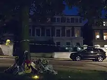 Amy Winehouse and Orlando Jewitt both lived and died on the square, and one of its houses once housed the West African Students' Union. Indian politician V. K. Krishna Menon lived in a house there from 1924 to 1947.[3] In May 2012, the property where Winehouse lived and died was put on the market for £2.7 million after her family decided it was inappropriate to live there.[4] Currently the area directly opposite the singer's former house is used as a shrine with gifts and letters left by fans around the trees and the fence to the square.[4] In the years since her death, at least fourteen 'Camden Square' street signs have been stolen by fans seeking memorabilia, which has cost Camden Borough Council over £4000 to replace.[5]
