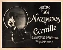 Camille is a 1921 American silent drama film starring Alla Nazimova as Marguerite and Rudolph Valentino as her lover, Armand. It is based on the play adaptation La Dame aux Camélias (The Lady of the Camellias) by Alexandre Dumas, fils, which was first published in French as a novel in 1848 and as a play in 1852. Camille is one of numerous screen adaptations of Dumas, fils' story.[1][2] The film was set in 1920s Paris, whereas the original version took place in Paris in the 1840s. It had lavish Art Deco sets and Rudolph Valentino later married the film's art director, Natacha Rambova.