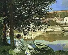 In Paris on 8 August 1867, Camille Doncieux gave birth to Jean, her first son with Claude Monet. Claude, who had spent the summer in Sainte-Adresse visiting his father and aunt Sophie Lecadre, returned to Paris for the birth and stayed for several days afterwards before returning to Sainte-Adresse.[5] He returned to Paris at the end of the year for the holidays and stayed in the cold one-room apartment that Camille shared with Jean.[6] In 1868 Monet went to live with Camille and Jean in Paris, hiding the fact from his father and aunt who thought he had abandoned "his mistress and child". To escape his creditors and live in a less expensive place, in the spring the three moved to Gloton, a small scenic village near Bennecourt. They were thrown out of the inn they were staying in for non-payment. Camille and Jean were able to stay with someone in the country, while Monet tried to obtain monies for survival.[7]
