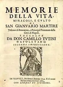 - Memorie della vita miracoli, e culto di San Gianuario martire vescovo di Benevento, e principal protettore della città di Napoli. Raccolte da don Camillo Tutini Napoletano, in Napoli, appresso Ottavio Beltrano, 1633