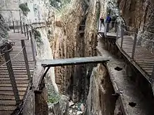 El Caminito del Rey (The King's Little Path) is a walkway pinned along the steep walls of a narrow gorge in El Chorro, near Ardales in the province of Málaga, Spain. The name derives from the original name of Camino del Rey (King's Pathway), abbreviated locally to el caminito.[1] The walkway had fallen into disrepair and was partially closed for over a decade. After four years of extensive repairs and renovations, it re-opened in 2015. It has been known in the past as the "world's most dangerous walkway" following five deaths in 1999 and 2000.[2]