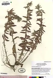 Camissoniopsis hardhamiae is a species of evening primrose known by the common name Hardham's evening primrose. It is endemic to California, where it grows in the chaparral and woodland of San Luis Obispo and Monterey Counties. It is a robust annual herb producing a hairy stem up to about half a meter tall. The leaves are lance-shaped to narrowly oval and up to 12 centimeters long. The nodding inflorescence bears flowers with yellow petals each a few millimeters long. The fruit is a cylindrical capsule up to 2.5 centimeters long containing several dark-colored seeds.