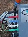 Closeup of camlock AC power connectors. In the US, typically, green is safety ground, white is neutral, and red, blue, and black are "hot" phases.