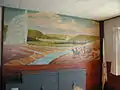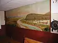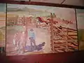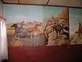 Three Italian prisoners left a remarkable artistic legacy with the sixteen murals they painted almost sixty years ago that can be seen today on the walls of the Officers Club, one of only a few camp buildings still standing. These men, known only by their signatures on the murals- -V. Finotti, E. Tarquinio, and F. DeRossi - painted a variety of western scenes. The large murals, most are six feet high and some as long as fifteen feet, depict cowboys, bar shootouts, a Native American smoking a peace pipe, a wagon train, a frontier stockade fort, and most surprisingly, Yellowstone National Park's Old Faithful geyser erupting in front of a cowboy audience. Ironically, although they were right in the middle of cowboy country, they of course as prisoners would have had very little opportunity to explore it. No doubt, some of the western images came from American movies while others the artists may have seen in books.