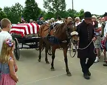 At the Memorial Day ceremony, a keynote speaker is typically part of the program, as is a local high school band, a bugler who plays Taps, and a cannon salute. Representatives of reenactment units in Civil War-period uniforms are usually present to act as an honor guard. Represented units have included members from the re-enacted 54th Massachusetts Infantry, the all-black regiment that earned fame in the Civil War and fresh recognition from its depiction in the 1989 film Glory. In the past, the cannon salute was fired by representatives from a U.S. Army Reserve or Kentucky National Guard artillery unit. In recent years, the salute has been fired from a replica 19th-century cannon, fired by Civil War re-enactors. The ceremony has been augmented by a procession of a horse-drawn limber-and-caisson bearing an empty, flag-draped coffin, symbolic of the many military personnel who have died in the service of the country. This is followed by a soldier leading a riderless horse, an homage to their loss.[15] In 2010, over 1,000 people attended the Memorial Day ceremony.[3]