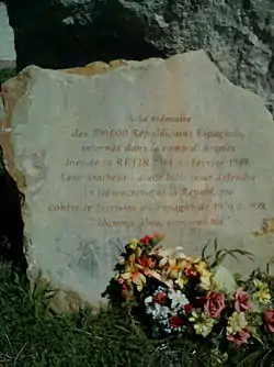 In memory of the 100.000 Spanish republicans, interned in the Camp of Argelès, during the RETIRADA in February 1939. Their disgrace: having fought for defending democracy and the republic against fascism in Spain from 1936 to 1939. Free Men, remember them.