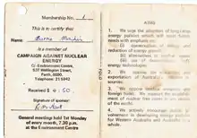 CANE was set up under the aegis of FOE after a meeting at University of Western Australia in late 1975. John Carlin, Barrie Machin, Michael Thomas and Peter Brotherton were present. Ken Strahan was an important part of the group and member of FOE. Barrie Machin was the first enrolled member of CANE and still has the founding membership card. Mike Thomas was the first Chairman. R. M. Hart's signature is on this card as a witness. Barrie Machin was Chairman of the movement from 1977–1978. This can be verified by checking the West Australian Newspapers for the period. There are many letters to the editor from the Chairman. Other Perth media archives, like the ABC, Channel Seven and Nine and Radio Stations carry records of interviews and appearances. Important eyewitnesses of the early days of CANE would include Bill Hare, Andrew Masterson, the novelist and John Hallam (who joined CANE from the Australia Party, John is still very active on nuclear issues with FOE, Kim Doohan, Peter Garrett, Professor Ian Clark, Robyn Juniper, ex-Minister of Aboriginal Affairs- Judyth Watson, Kingley Palmer ex-head of Institute of Aboriginal Studies in Canberra. Under Dr. Machin's guidance the first Hiroshima Day was held this coincided with his Hiroshima Exhibition at the University of WA. Bill Hare, who later became active in ACF and Greenpeace, was also part of the team headed by Barrie Machin. John Hallam was also a key member in this period, Andrew Masterson was a very valuable and young contributor. Peter Brotherton of FOE played a key role in all activities and advice. Barrie Machin and Kim Doohan with one other person broadcast Alternative News on FM 6NR for six months at Western Australian Institute of Technology now Curtin University. It is unfortunate that some of these facts of history have been ignored in a recent account of CANE called 'Stepping Out' the authors of which have admitted they did not check the archives and based their book on limited interviewing, which excluded many key personnel, activists and witnesses. They argue that theirs is a postmodernist interpretation. They did not interview Barrie Machin, who was relegated to the status of a volunteer, nor does it seem to be the case that they interviewed other key founders and later chairperson-Peter Kaldor. Paul Keating was at the Labour Party conference and could have been interviewed as well. Many of the facts of CANE in this book and in the previous Wikipedia content for CANE were unverifiable. There are now some verifiable sources in this entry. Later CANE Chairpersons included Zoe Sofoulis and Peter Kaldor followed by Annabelle Newbury, David Worth and Louise Duxbury. An early but minor member at the time included Jo Vallentine who was later elected to parliament in 1984 as a Nuclear Disarmament Party candidate.