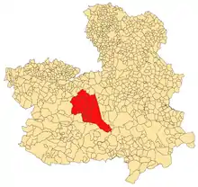 Including the easternmost fringes of the Montes de Toledo in its western part, the territory spanned across an area of 3,983 km2 (2,421 in the current-day province of Toledo and 1,653 in the current-day province of Ciudad Real), limiting in the plains of La Mancha with the Campo de Calatrava (linked to the Order of Calatrava) and the Campo de Montiel (linked to the Order of Santiago).[6]