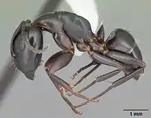 Workers can range from 3.5 to 7.5 mm (0.14 to 0.30 in) in length.[1] The queen ant's size can range from 4 to 10 millimetres (0.16 to 0.39 in).[2] This species can be distinguished from other subgenus by little amounts of erect hairs on the gena, limited erect hairs on the clypeal disc and finally by the color which is a concolorous dark brown-black.[1]